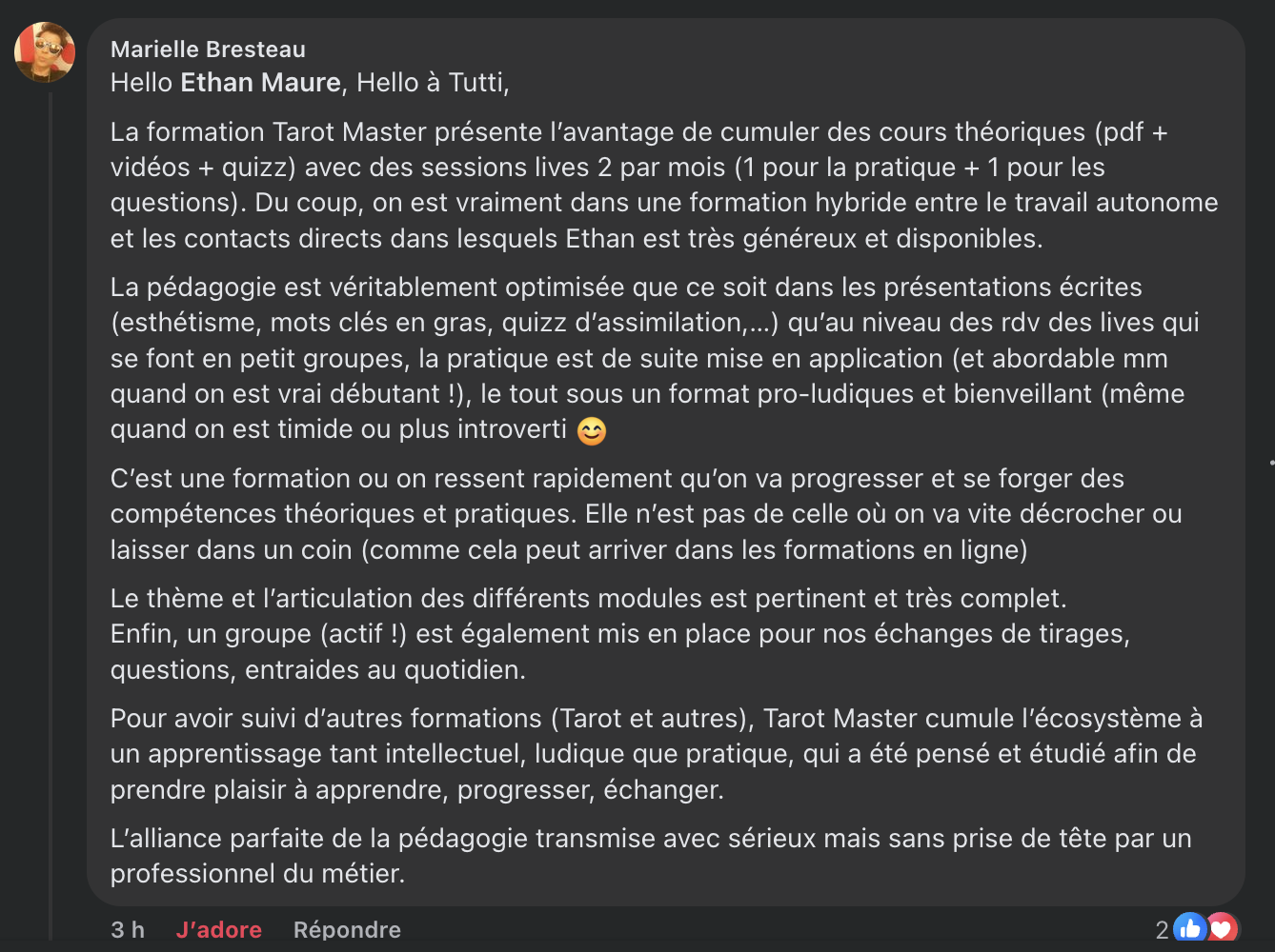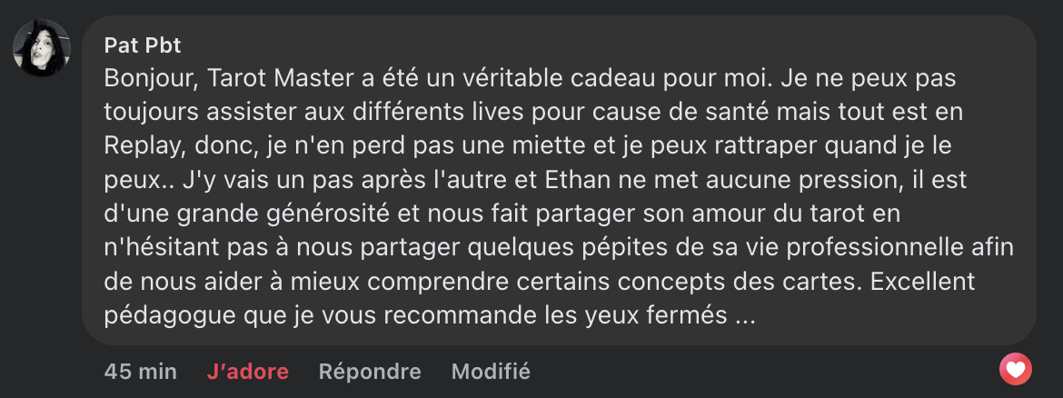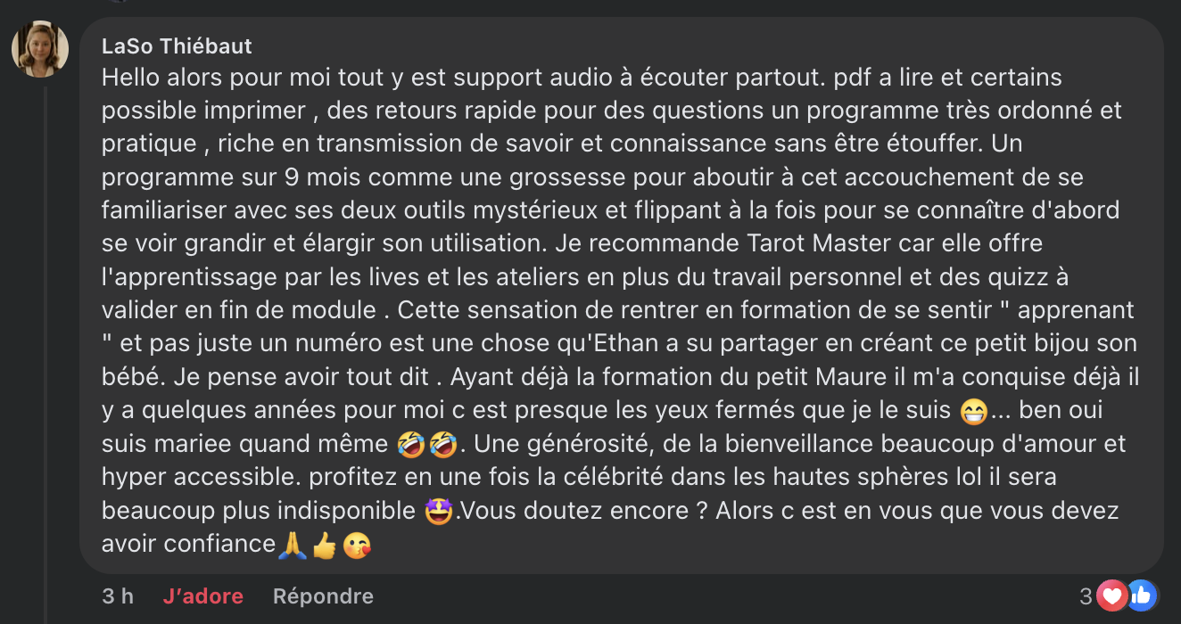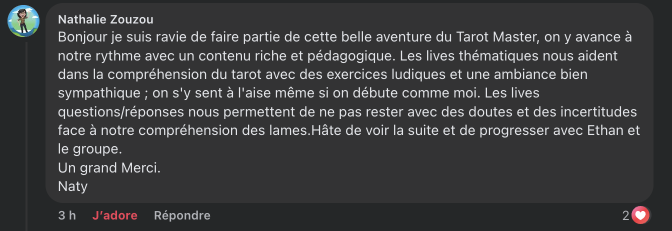 Une belle communauté o tu vas rencontrer 74 autres autres élèves qui partagent la même passion que toi pour le Tarot avec énormément d'autres centres d'intérêt en commun. La communauté, c'est hyper important. Et je peux même te dire que dans l'édition 2024/2025, de très belles et grandes amitiés sont nées !