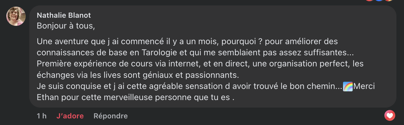 De toute façon, si tu veux apprendre à tirer le Tarot et donner des consultations, tu n'as pas 36 000 solutions. Soit tu apprends tout(e) seul(e)... et tu mets beaucoup de temps (et je t'épargne les doutes, les blocages...), soit on te transmet les connaissances du Tarot (et là, tu gagnes du temps et beaucoup d'assurance).