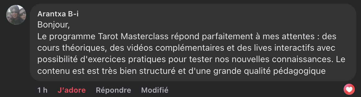 C’est une excellente question ! TAROT MASTER est un programme 100% nouveau, complet et structuré qui reprend certains concepts déjà abordés dans mes formations individuelles, comme les Arcanes Majeurs ou le tirage en croix. Toutefois, ce n'est pas un doublon. Toutes les vidéos et supports de cours sont nouveaux.